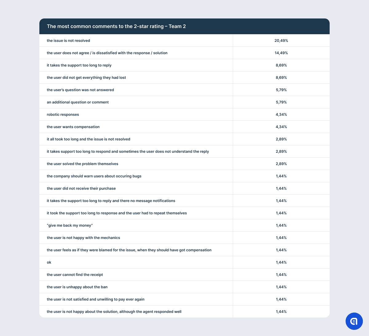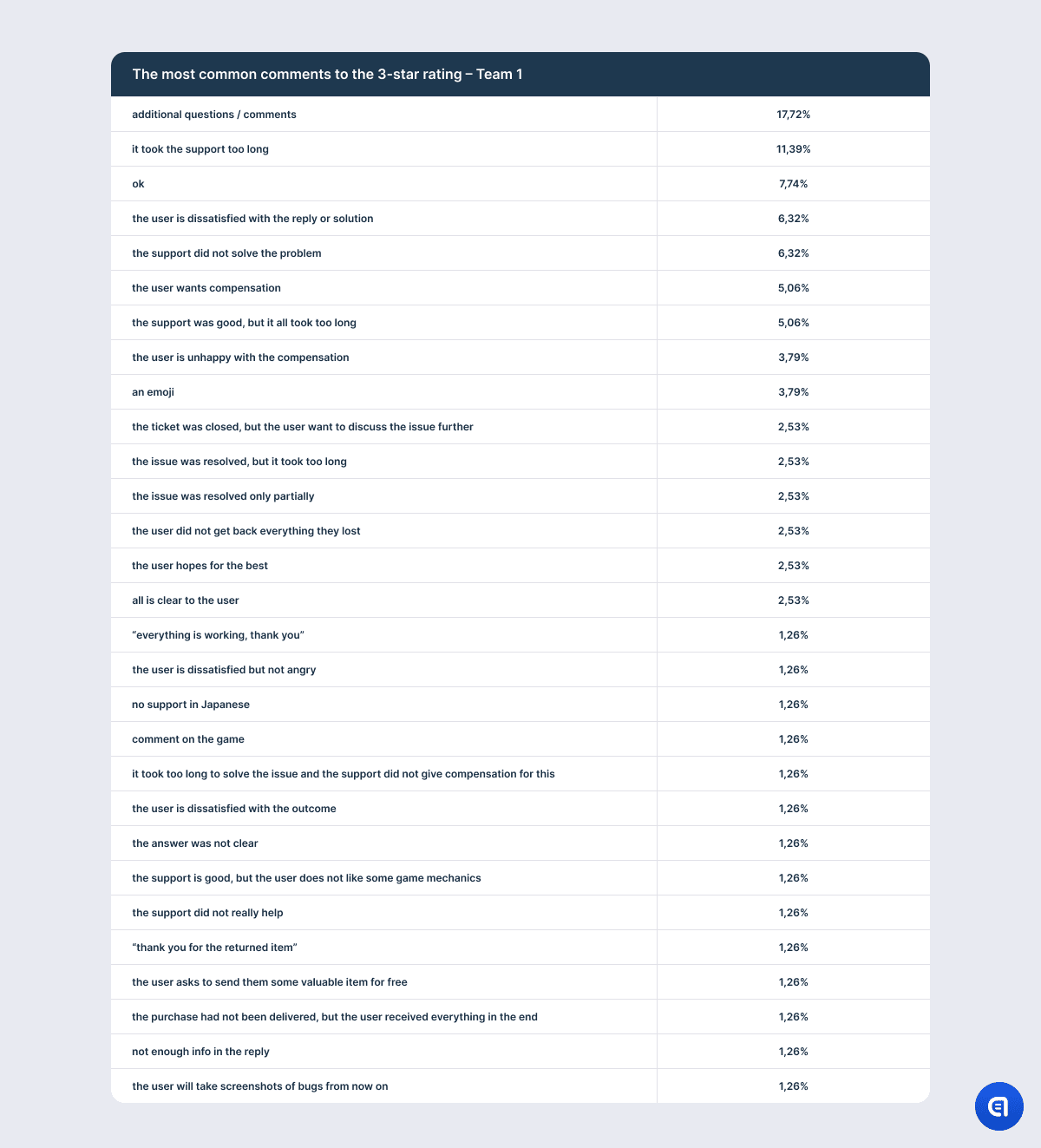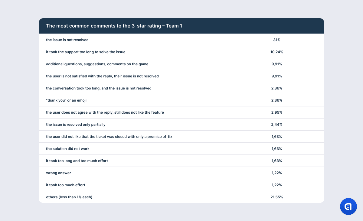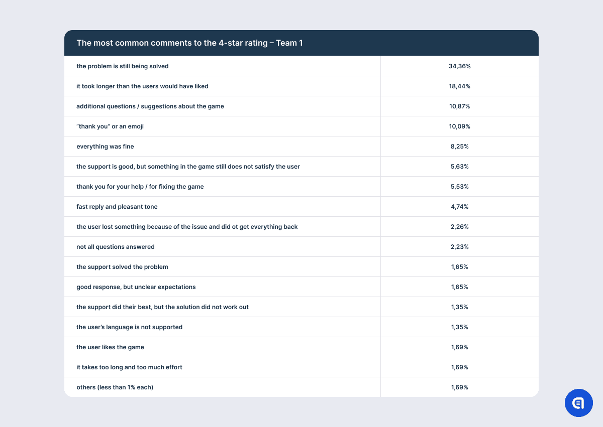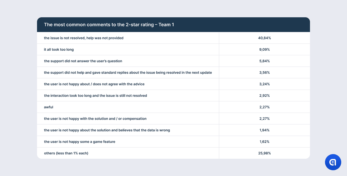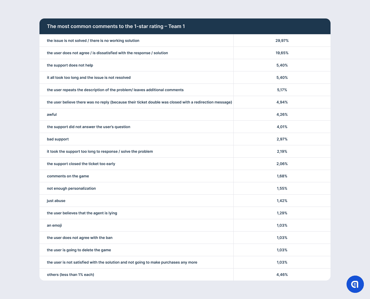 For example, the table with the results on the 1-star rating shows that the most irritating aspect for the users is that their issue is not resolved. However, this needs clarification. It is not that the support agent did not understand the issue or that they lacked the competence to solve the problem. The point is that there is a mass issue in the game, and in order to fix it, developers need time. So support often has to explain that the company has not forgotten about the users and that the dev team spares no effort to find a solution; however, it is physically impossible to fix the game at this very moment. It does not matter how good the agent is or how much empathy they put into their response. They may even offer an effective temporary alternative solution. However, if the problem has caused the user significant discomfort, anger, or frustration, the mere promise to fix the issue in the future will not calm them down. So at the end of the dialogue, the agent may still receive one star.
