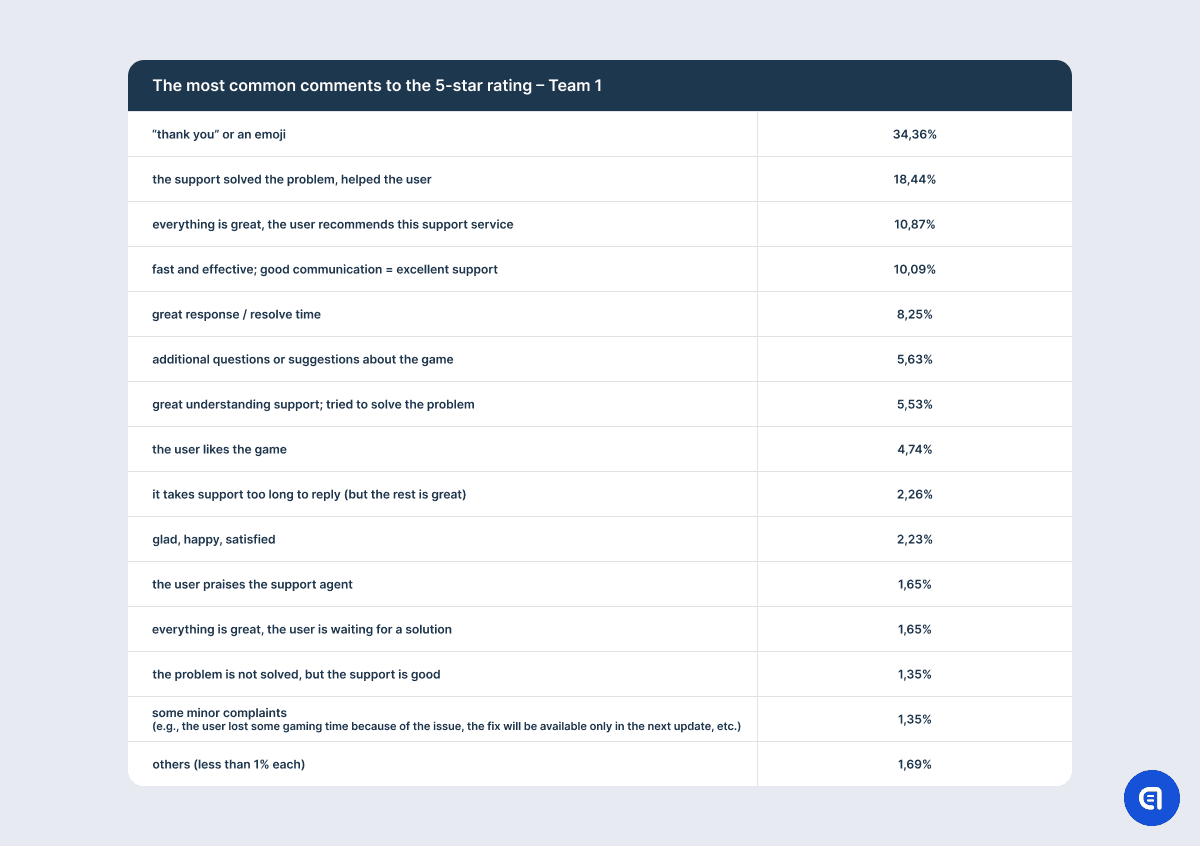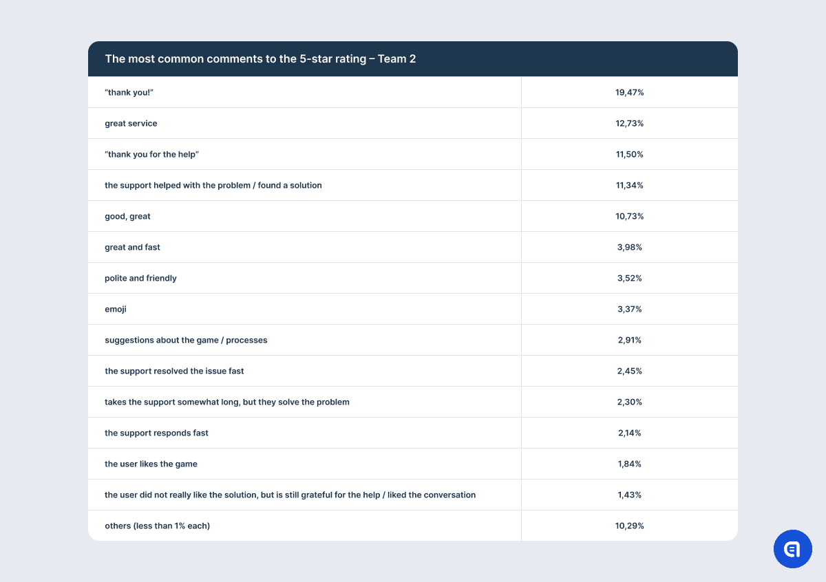 We can see it even in the comments to 5-star ratings, although positive feedback is the closest to the ideal CSAT model that companies want. For example, users mention pleasant conversation, understanding and empathy, effective communication, attention to detail, and all of these remarks are definitely related to their chat with support. Some users even specifically underline the quality of communication since their issue is not yet resolved. However, there are users who praise the game and the dev team and share their ideas and recommendations on gameplay that are not connected to the initial request.