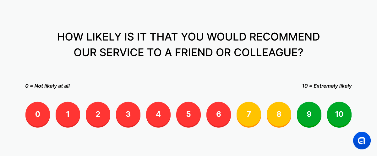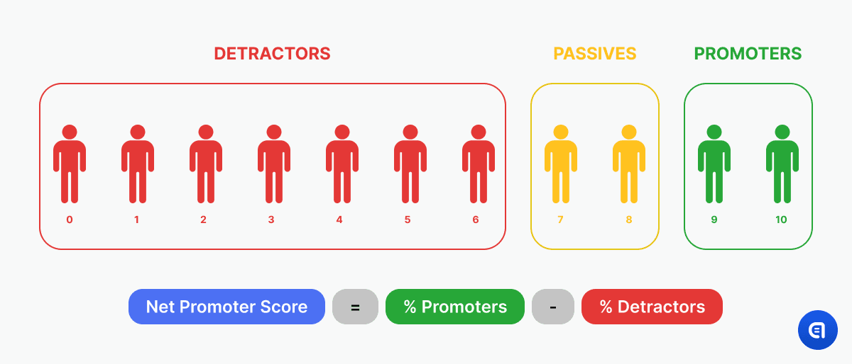 Those customers who are ready to recommend you to others are called promoters. Those who are not quite sure are called passives. And those who openly decline to promote you are considered detractors. NPS is used to estimate the overall loyalty to the brand.