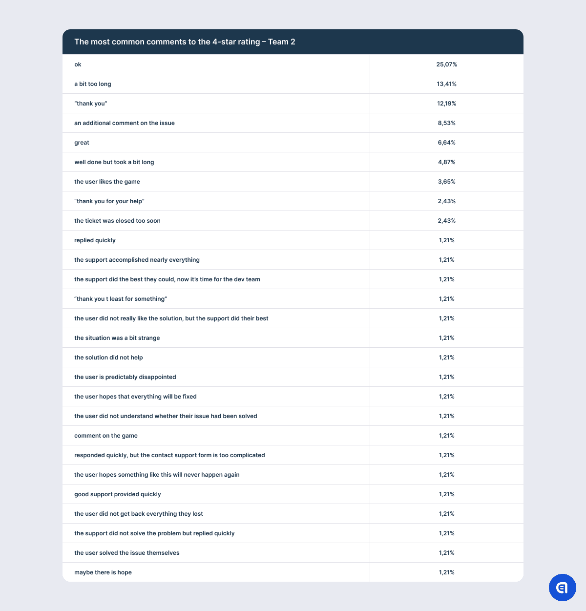 The idea is that if CSAT indicates the quality of customer service, then specific remarks in user feedback should help us create a list of characteristics that make up good or bad support. However, in practice, the points that users bring up do not correspond only with the dialogue with a support agent but with the whole interaction with the game or the brand.
